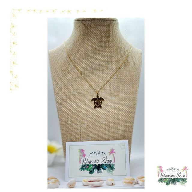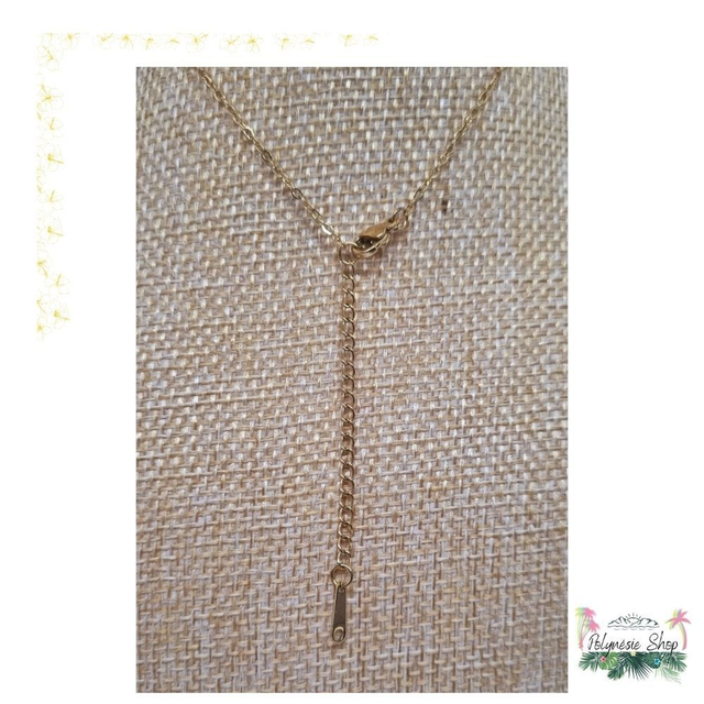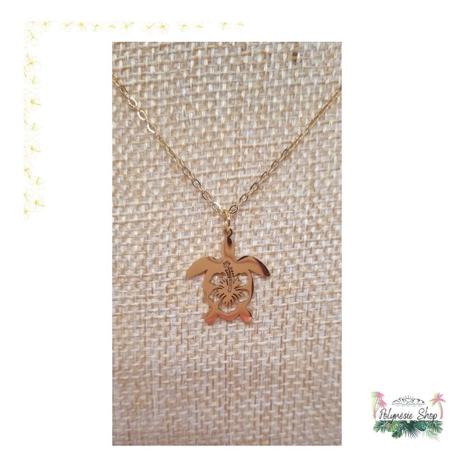 Collier en acier inoxydable gold honu (tortue) et hibiscus. La tortue a plusieurs significations dans le tatouage polynésien :l'éternité, la fertilité, l'harmonie, l'attachement à la famille, la sagesse, la longévité, le bien-être… Quant à l'hibiscus, sa fleur est très répandue en Polynésie. Une belle association donc dans ce bijou. Il est ajustable car à sa chaine d'extension.