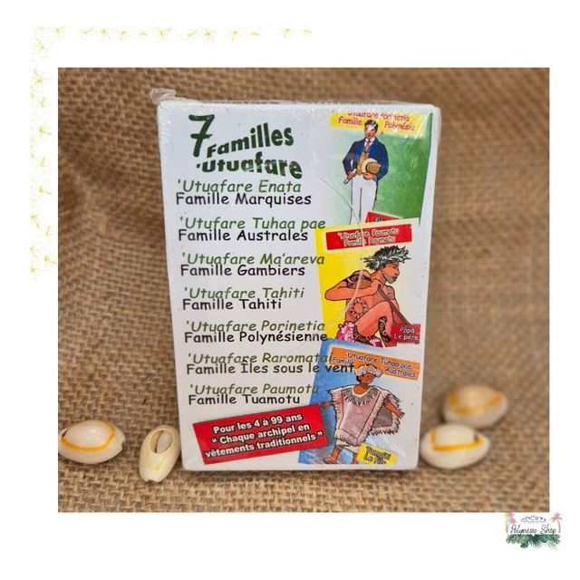 Redécouvre le jeu des 7 familles avec une version aux couleurs de la Polynésie. Présentation des 7 familles: Marquises, Australes, Gambier, Tahiti, Polynésienne, Îles Sous-le-Vent et Tuamotu. Un jeu ludique qui fait voyager tout en s’amusant.