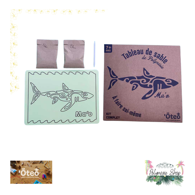 Le kit contient tout le nécessaire pour réaliser un tableau de sable aux motifs façon tatouage d'un requin (ma'o en tahitien) :