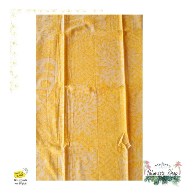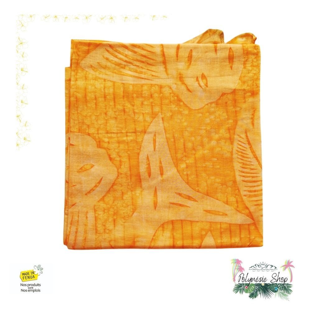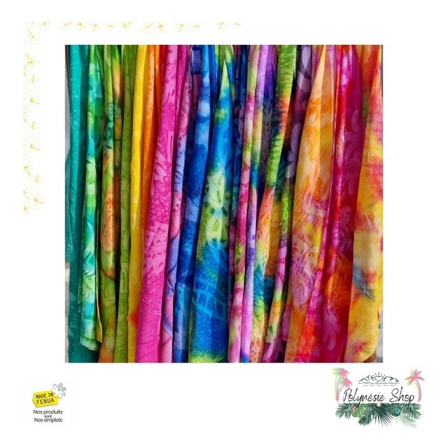 Ce paréo (pāreu en tahitien) est entièrement réalisé à la main, à Tahiti, de façon traditionnelle avec la technique de l’héliographie (séchage au soleil avec des caches).