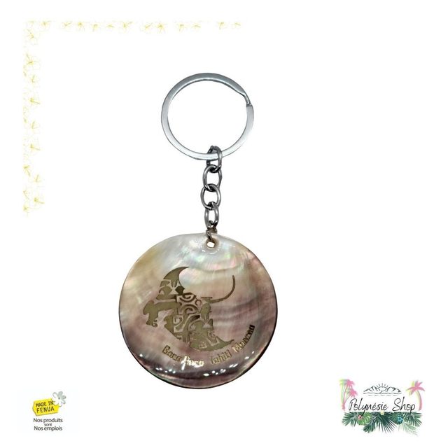 De fabrication artisanale, chaque porte-clés est donc unique de par sa couleur et ses reflets. Les dessins dorés et la nacre sont protégés par une résine.